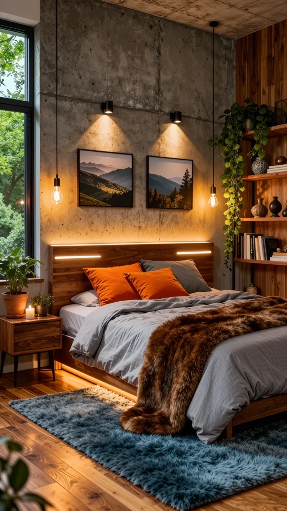 How cool is this mix? You’ve got the raw, industrial concrete wall softened by warm wood paneling, deep green plants, and a rich, earthy color palette. The pop of burnt orange pillows and that luxurious faux fur throw make the gray bedding instantly cozy. Ambient lighting from the headboard and hanging bulbs adds a dramatic, welcoming glow. It feels like a chic loft that opens right up to a mountain forest.