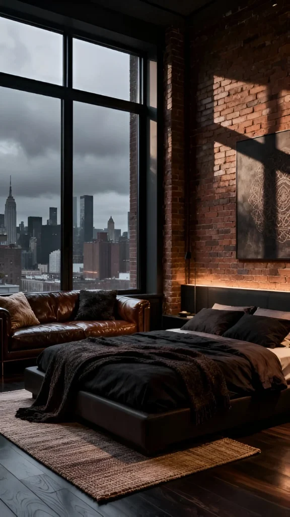 If you love dark, moody luxury, this is it. The exposed brick wall and massive city window give it a strong, industrial backbone, but the rich, dark bedding and beautiful leather sofa make it feel instantly intimate. The soft, amber light bouncing off the textures is just gorgeous. It’s sophisticated, a little bit dramatic, and the perfect cozy escape after a long day in the city.