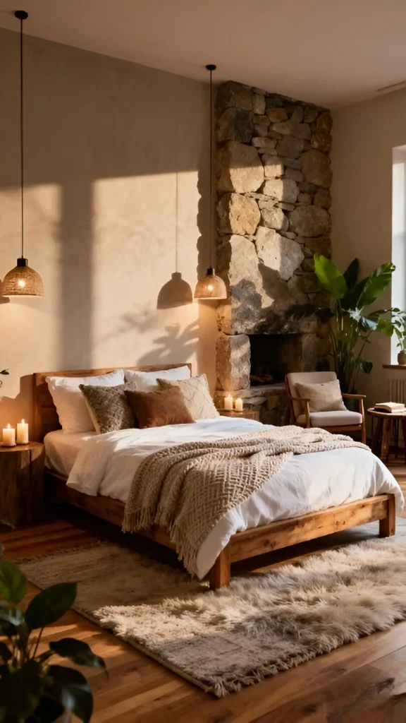 This space is pure, rustic bliss! The floor-to-ceiling stone fireplace is an incredible focal point, giving the room a natural, grounded feel. Paired with a simple wooden bed frame and multiple layers of cozy, textured throws and pillows, it’s just so inviting. The warm sunlight and the scattered candles create a wonderful, peaceful atmosphere. Imagine snuggling up here on a crisp autumn morning!