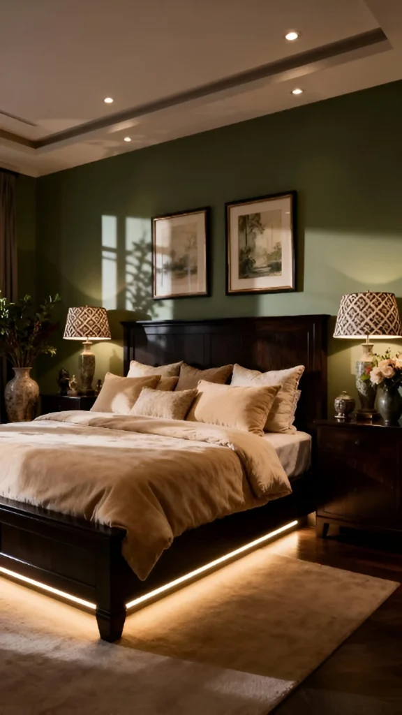 This room has a beautiful, polished feel. The deep, dark wood furniture and that stunning olive-green accent wall create an atmosphere of refined comfort. The plush, beige bedding and oversized lamps with patterned shades add texture and softness. The low-level under-bed lighting is a subtle but genius touch, making the whole space feel grounded and warm. It’s elegant, cozy, and perfect for a restful night.