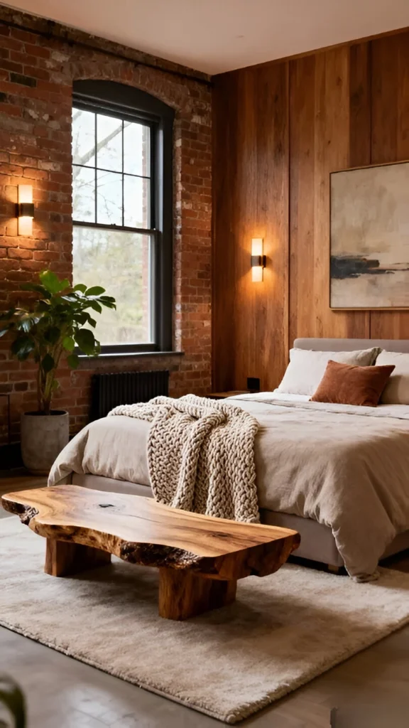 This bedroom perfectly blends rugged and refined. The exposed red brick and dark window trim contrast beautifully with the warm, rich wooden wall paneling. That live-edge wood bench is a stunning, organic centerpiece! A large, creamy knit throw on the bed and the warm-toned rug soften the harder materials, making it feel like a cozy, high-end mountain lodge in the middle of an old factory.