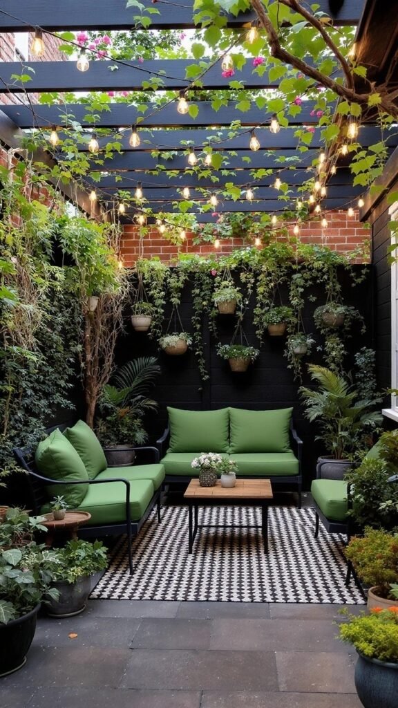 Using an outdoor rug is a game-changer for defining a seating area, making it feel like an actual outdoor “room.” The rug anchors the furniture and adds a lovely pop of pattern. Notice how the plants around the edge blur the lines with the garden, keeping the space open but perfectly contained. It’s a simple trick to create separation and a whole lot of style!
