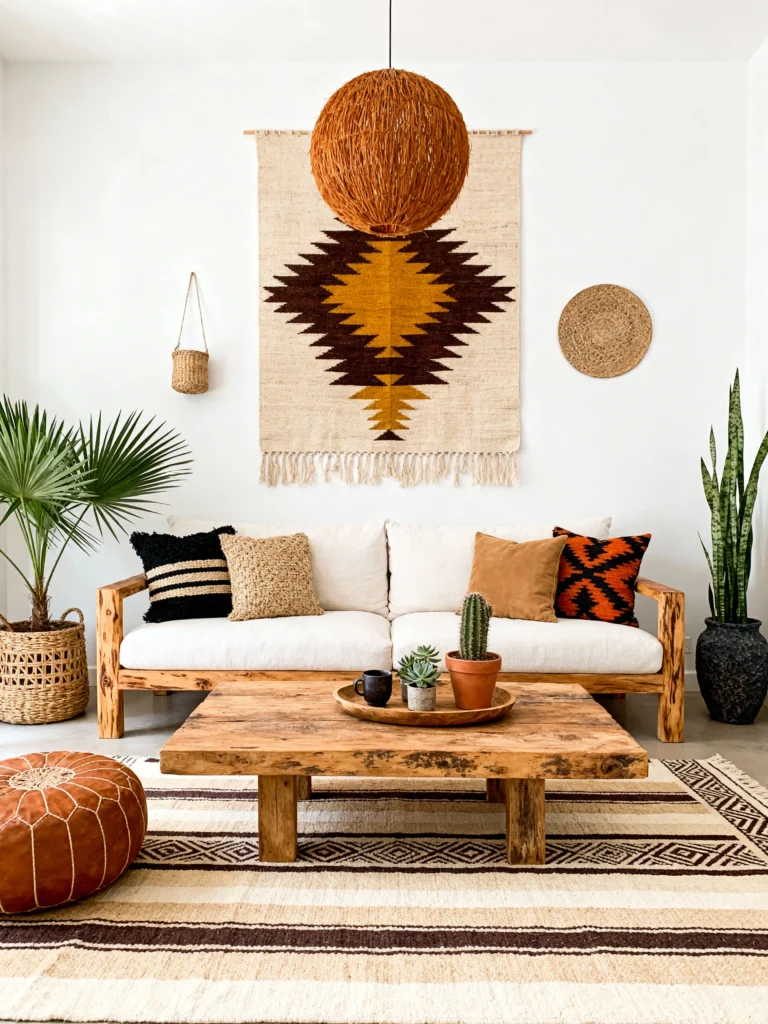 The hero here is the texture. Look at that coffee table—it’s chunky, raw wood that looks like it has a story to tell. By keeping the walls white and the furniture low-profile, the large geometric wall hanging becomes the focal point. It’s proof that you don’t need fifty colors to make a statement; you just need a few high-quality, natural materials like leather, wool, and wood to do the heavy lifting.