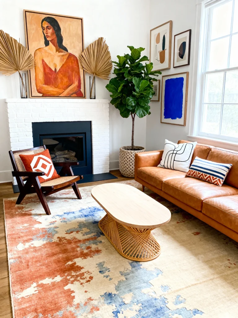 The rug choice here is genius. Instead of a traditional pattern, it’s an abstract wash of terracotta and blue, which mirrors the art on the walls. It makes the room feel cohesive without being “matchy-matchy.” If you have a leather sofa, try pairing it with a light-colored wood coffee table like this one to keep the vibe light and approachable.