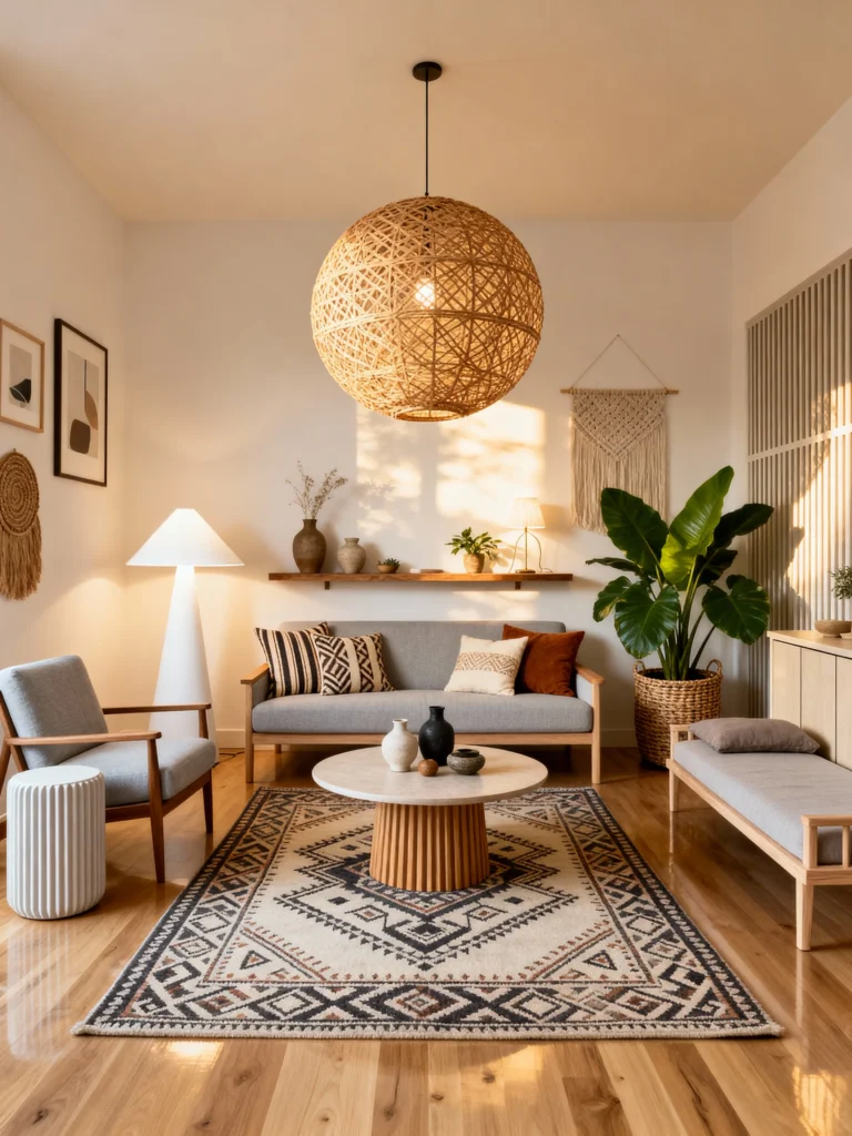 This is the ultimate “chill” zone. It’s very symmetrical, which naturally makes our brains feel relaxed. The giant spherical pendant light is like a paper moon hanging in the center of the room, providing a soft, diffused glow that’s way better than harsh overhead recessed lights.