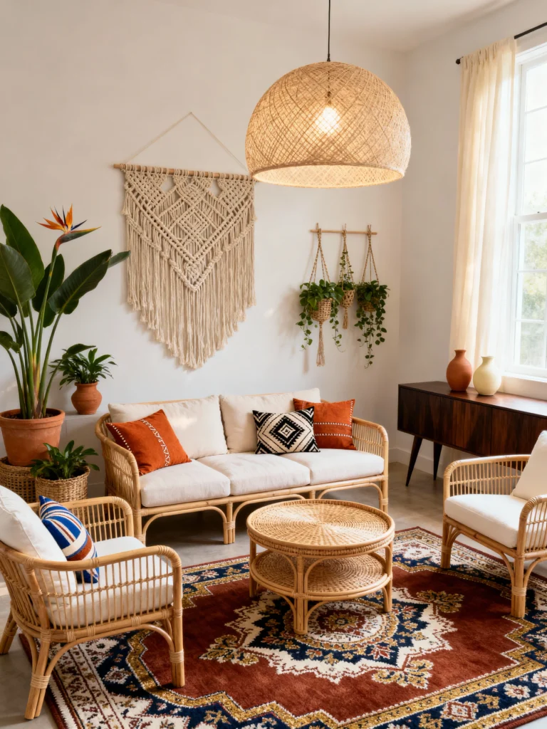 If you love the “Natural” look, this is your blueprint. Almost everything here is made of plant fibers: the rattan sofa, the wicker chairs, the woven rug, and that massive macramé piece.