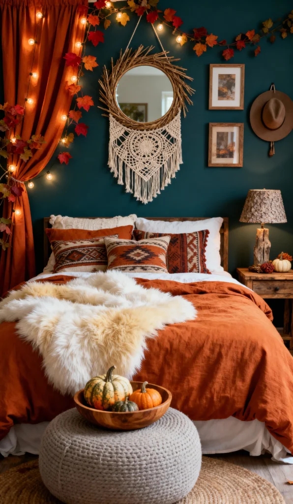 This is the ultimate autumn mood! The deep teal wall is the perfect backdrop for those rich terracotta and burnt orange tones. I love how the leaf garlands and string lights bring the cozy fall magic right inside—it’s super festive without being overdone. The mix of textures—the macrame mirror, the fuzzy throw, and the chunky knit pouf—makes it feel so welcoming. And those little pumpkins? Adorable! It’s a truly maximalist, but perfectly curated, fall fantasy.