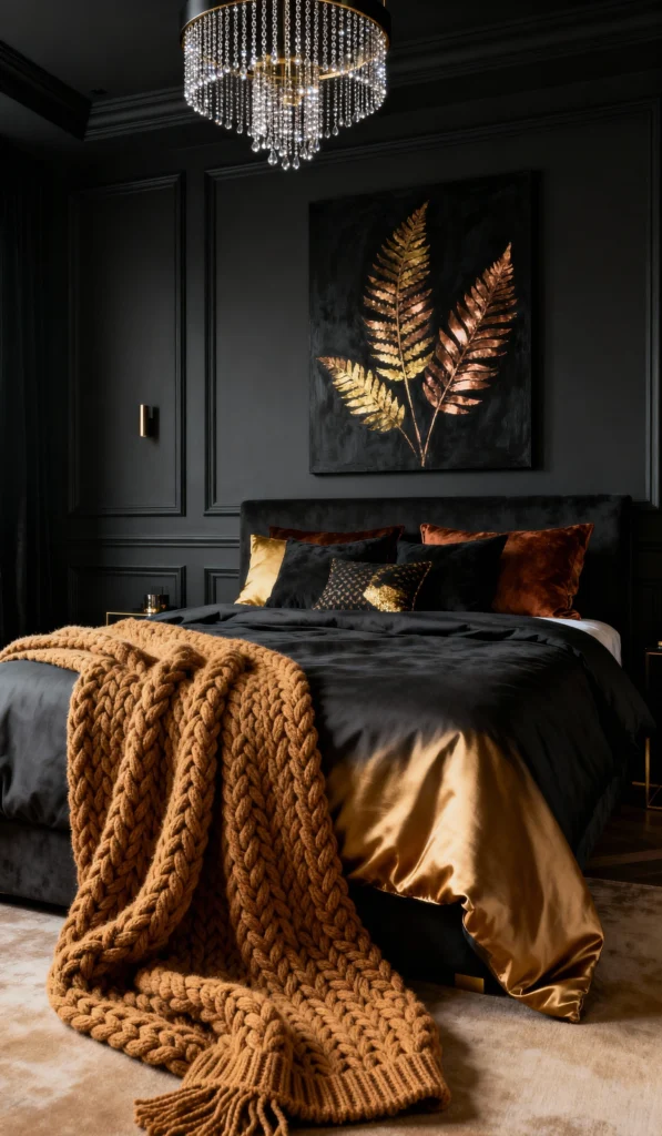 Okay, now this is pure opulence! The black paneled walls set a super sophisticated tone, and that spectacular crystal chandelier just screams luxury. The bedding is a stunning mix of black and shimmering gold-bronze silk, topped with a massive, cable-knit caramel throw. That large artwork, with the metallic gold and copper leaves against the black, ties the entire rich color palette together. It’s a truly glamorous, high-end, and deeply inviting space.