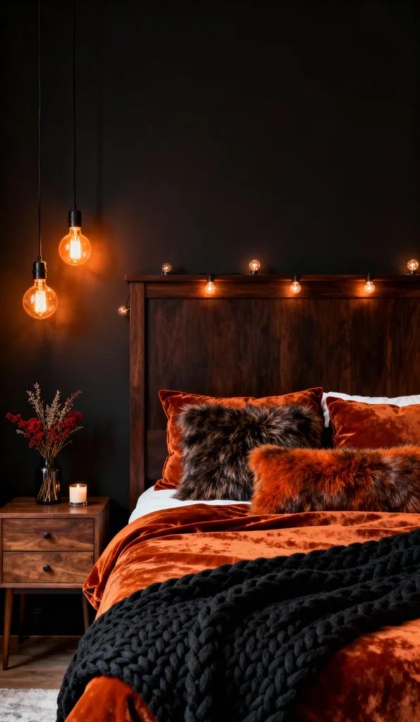 The black wall and dark wood headboard make that burnt orange velvet duvet absolutely pop. It’s all about luxurious textures here: the plush velvet, the furry accent pillows, and that chunky black knit blanket. The exposed Edison bulbs hanging on the side and the string lights above the headboard add a beautiful, warm, and slightly industrial glow. It feels incredibly sultry and perfect for a long weekend lie-in. Total sophisticated coziness!