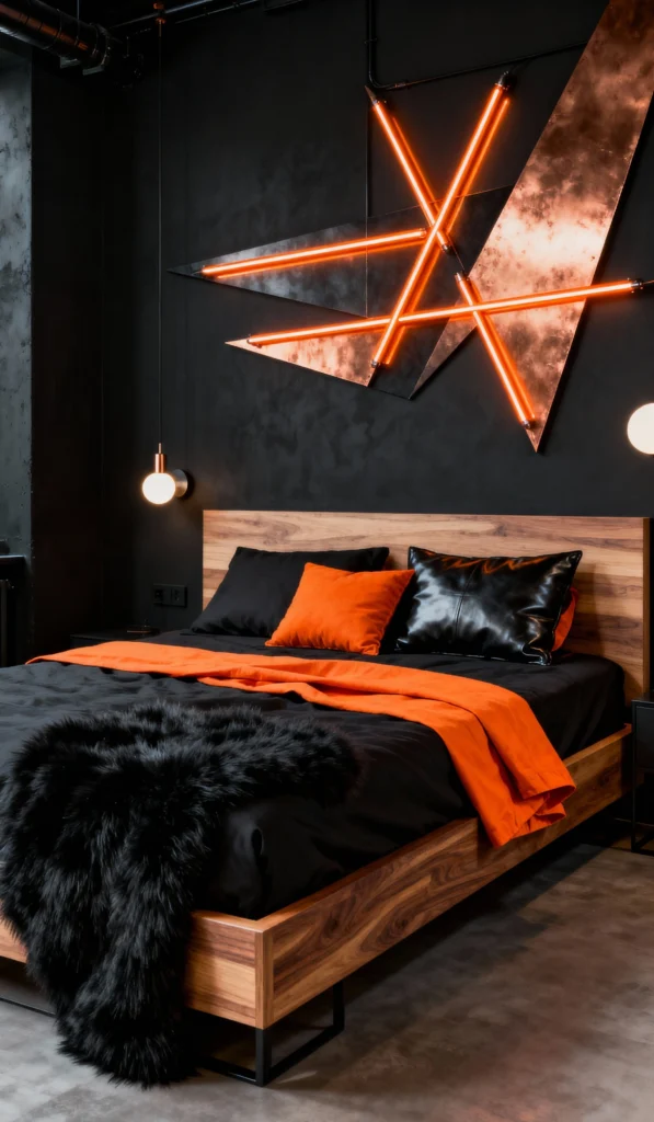 This room is for the friend who loves a little edge! The dark backdrop is softened by the warm wood bed frame and a few pops of orange and a cozy black fur throw. But the real star is that incredible geometric wall art with the orange neon tubes. It’s industrial, modern, and adds such a vibrant, high-energy glow to the space. It proves that you can mix sleek modern design with soft, comfy textiles for a truly unique and stylish sanctuary.