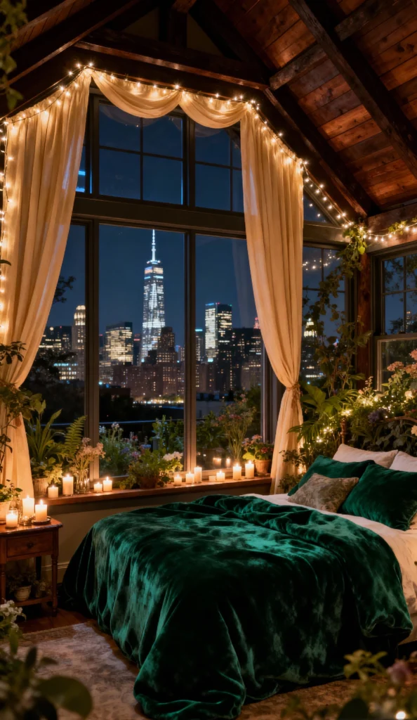 Okay, this is pure magic! That view of the city skyline at night through the huge windows is already amazing, but look at how cozy they made it. The rich, emerald green velvet comforter and those sheer, twinkling curtains make the space feel like a luxurious, hidden jungle retreat. The string lights everywhere and all those candles are giving off the most romantic, warm glow. It’s moody, botanical, and the perfect escape from the hustle and bustle outside.
