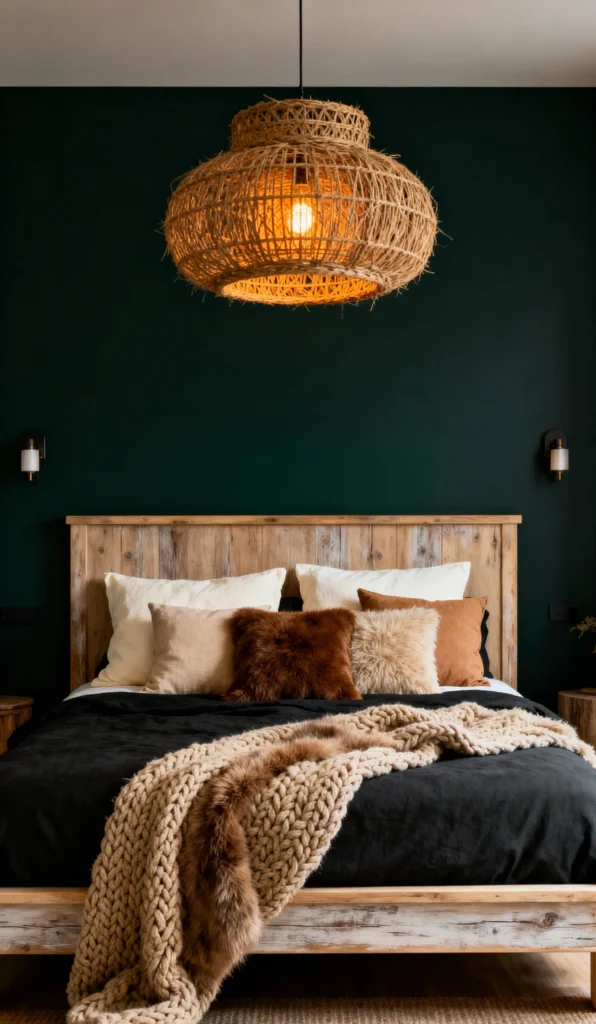 Swapping the black wall for a deep, rich hunter green totally changes the mood here—it’s moody but organic. The rustic, reclaimed wood bed frame and the huge, woven basket pendant light ground the space in natural textures. The bedding is a beautiful mix of black linen, cream, and warm taupe pillows, all topped with a chunky knit and faux fur throw. It’s an elevated, earthy, and supremely comfortable look!