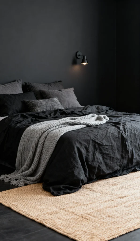 For my minimalist friends who still crave coziness, this one’s for you. This look is all about texture within a tight color palette—black and shades of dark grey. The crinkled black linen bedding looks incredibly soft, and the chunky grey throw adds that necessary layer of warmth. The simple jute rug on the dark floor is a great way to add a natural, light-colored element without disrupting the monochrome theme. Clean, modern, and perfectly snug.