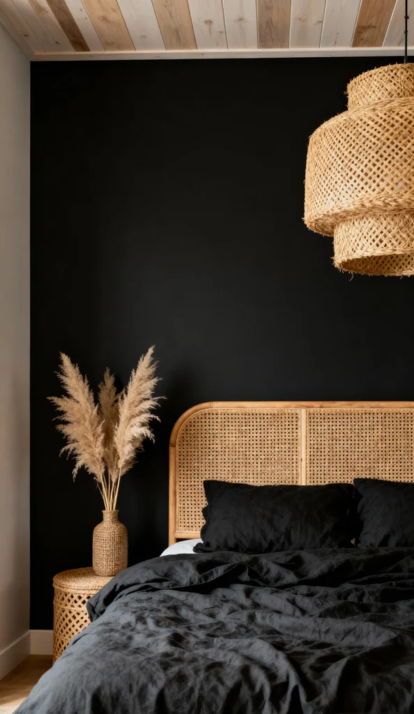 Talk about dramatic! Black walls, black linen bedding, and a bright orange throw—it’s a bold, high-contrast look that definitely makes a statement. I’m obsessed with the ceiling; that light wood panelling keeps the dark walls from feeling too heavy. The natural texture comes in with the woven pendant lights and those two large wicker wall hangings above the bed, giving it a cool, global, and slightly bohemian vibe. It’s chic, sharp, and still somehow super cozy.