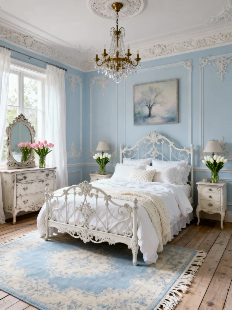 If you’ve ever wanted to wake up inside a literal cloud, this is it. The soft baby blue walls and intricate white molding give off major French chateau vibes. I love how the distressed white furniture keeps it from feeling too stiff—it has that “perfectly lived-in” antique charm. Those white tulips are the perfect finishing touch. It’s airy, elegant, and totally timeless.