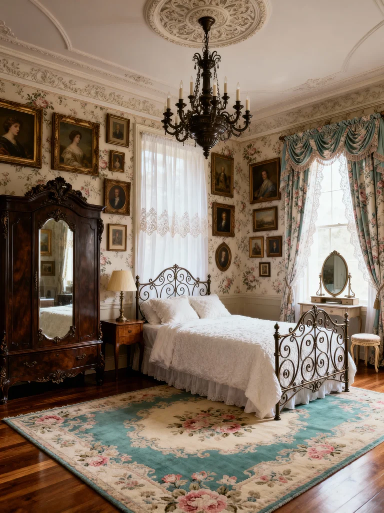 Talk about a wall with personality! This room is a masterclass in “more is more.” The floral wallpaper paired with a massive gallery of vintage portraits makes the space feel like a cozy private museum. The brass bed frame is such a classic choice, and that teal rug adds a pop of color that ties everything together. It’s quirky, historic, and incredibly inviting.