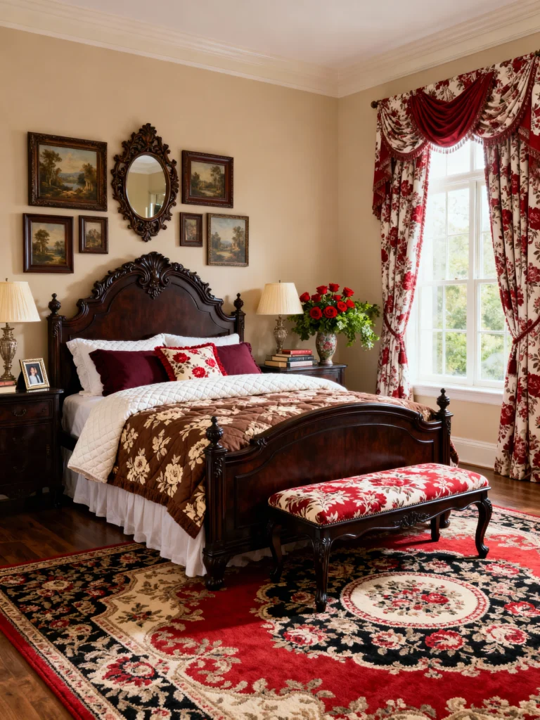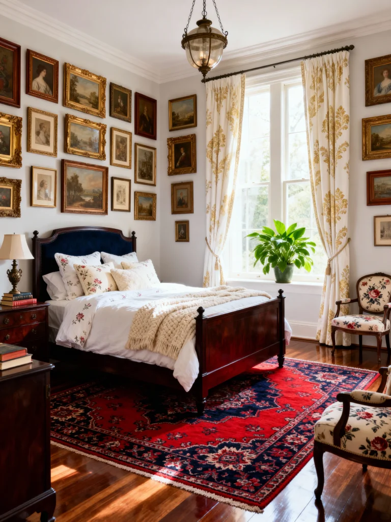 This room feels so sophisticated. The deep mahogany bed frame and that vibrant red Persian rug create a really grounded, expensive feel. My favorite part has to be the mismatched gold frames covering the wall—it feels like a collection of memories rather than just “decor.” It’s traditional, but the bright window keeps it feeling fresh.