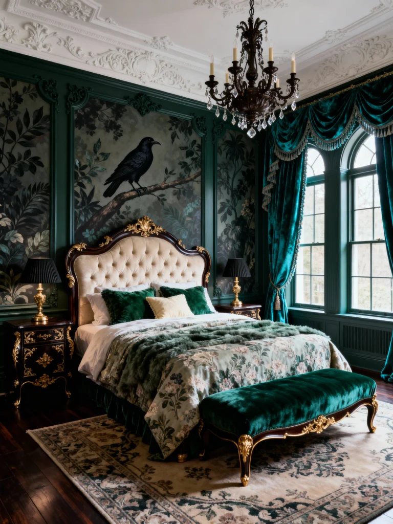 This one is for the lovers of the “Dark Academia” aesthetic. That wallpaper with the crow is such a cool, slightly edgy focal point. The mix of dark teal velvet and gold accents makes the whole space feel mysterious and expensive. It’s dramatic, moody, and honestly, just plain cool.