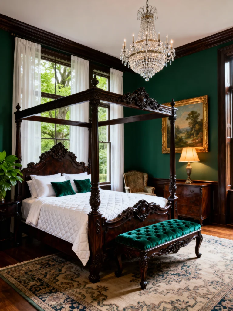 If “opulence” was a room, this would be it. That deep emerald green on the walls is so moody and chic! The velvet quilted bedding looks like the softest thing on earth, and that crystal chandelier is a total showstopper. It feels like a high-end boutique hotel suite. If you want a room that feels like a warm hug, dark colors are the way to go.