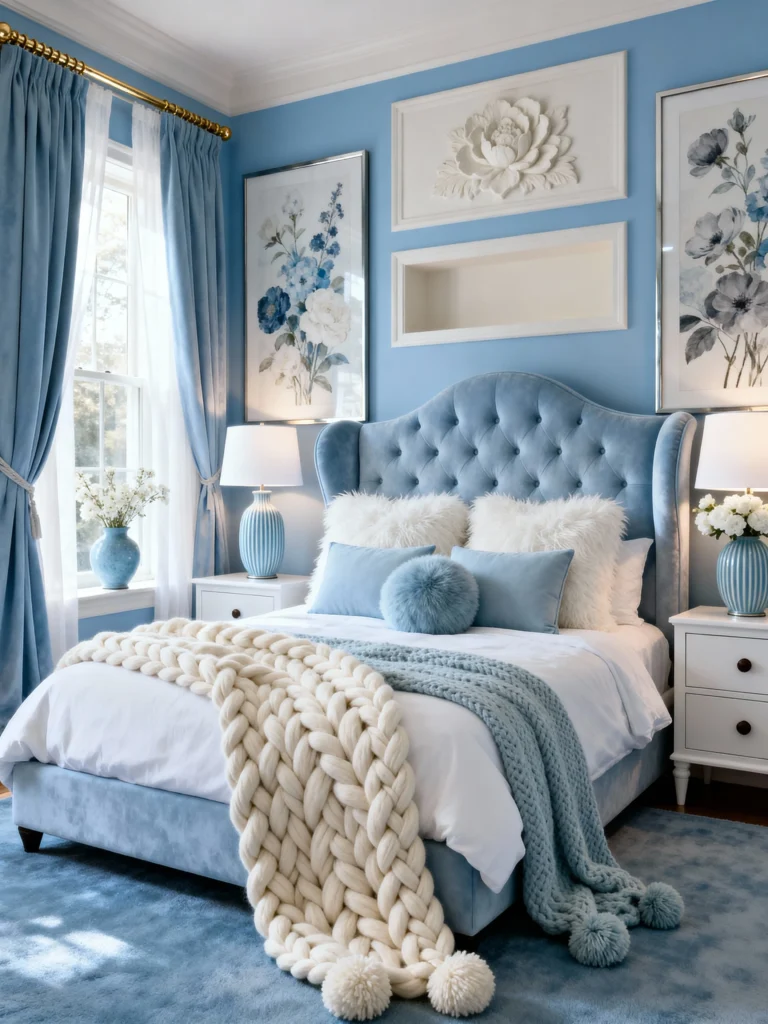 Can we talk about this blue? If you struggle with sleep, a monochromatic blue palette is scientifically one of the most calming choices you can make. The velvet winged headboard looks so plush you could dive right into it.