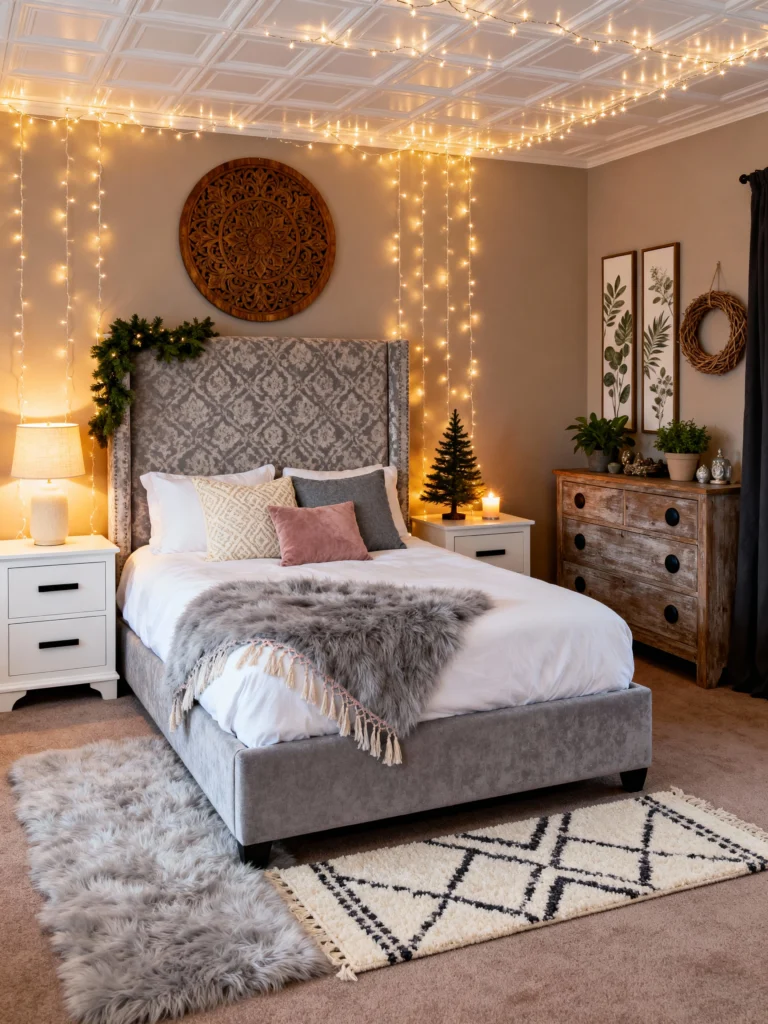 This room is all about cozy, evening vibes. Using fairy lights as a backdrop is such a budget-friendly way to create a “waterfall” of light. It’s whimsical and romantic. The grey damask patterned headboard adds a bit of old-world elegance to a modern setup.