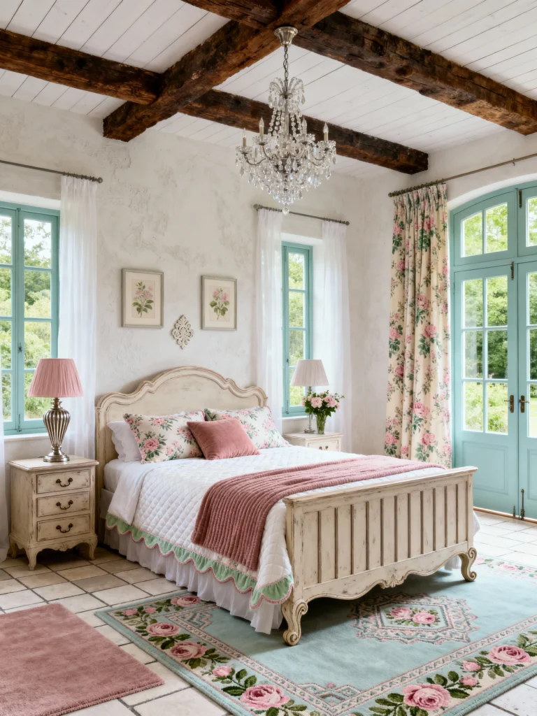 This one is for the lovers of French country style. Those exposed dark wood beams against the white plaster walls create so much character! It’s all about the “shabby chic” vibe here—notice the distressed finish on the bed frame and the nightstands.