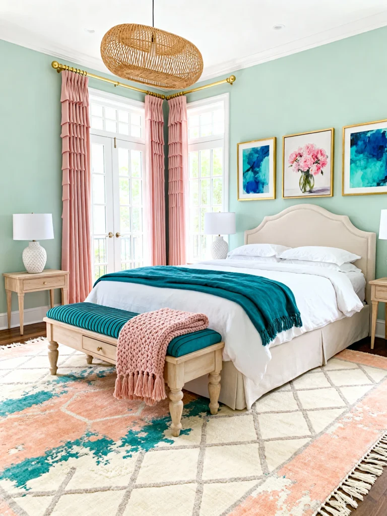If you love color, don’t be afraid to mix it up! Mint green walls paired with coral-pink curtains shouldn’t work, but they absolutely do. It feels fresh, energetic, and fun. The teal throw at the end of the bed adds just enough depth to tie the greens and blues together.