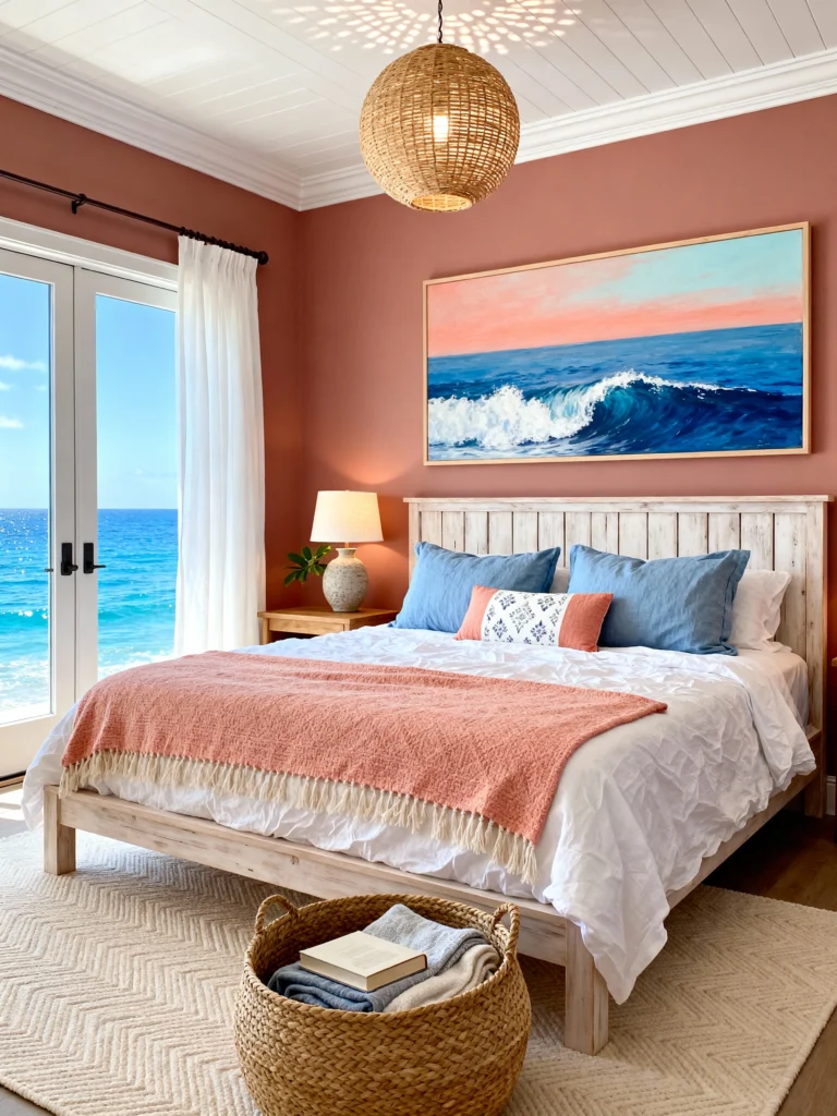 I can almost smell the salt air looking at this! The terracotta-toned walls are a warm, earthy choice that perfectly balances the bright blue of the ocean outside. That “wave” artwork above the headboard is a total statement piece.