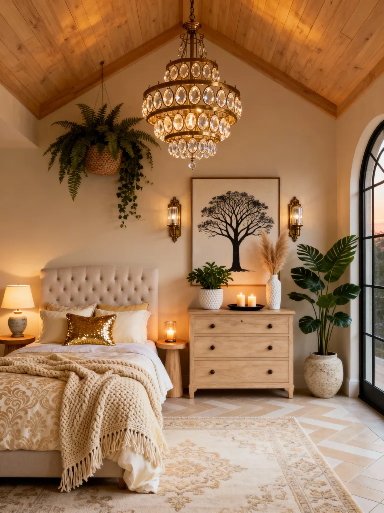 If you want your room to feel like a permanent sunset, this is it. The mix of that warm wood vaulted ceiling with the sparkling crystal chandelier is just pure magic. I love how the neutral, tufted headboard keeps things grounded while those gold accents make it feel expensive.