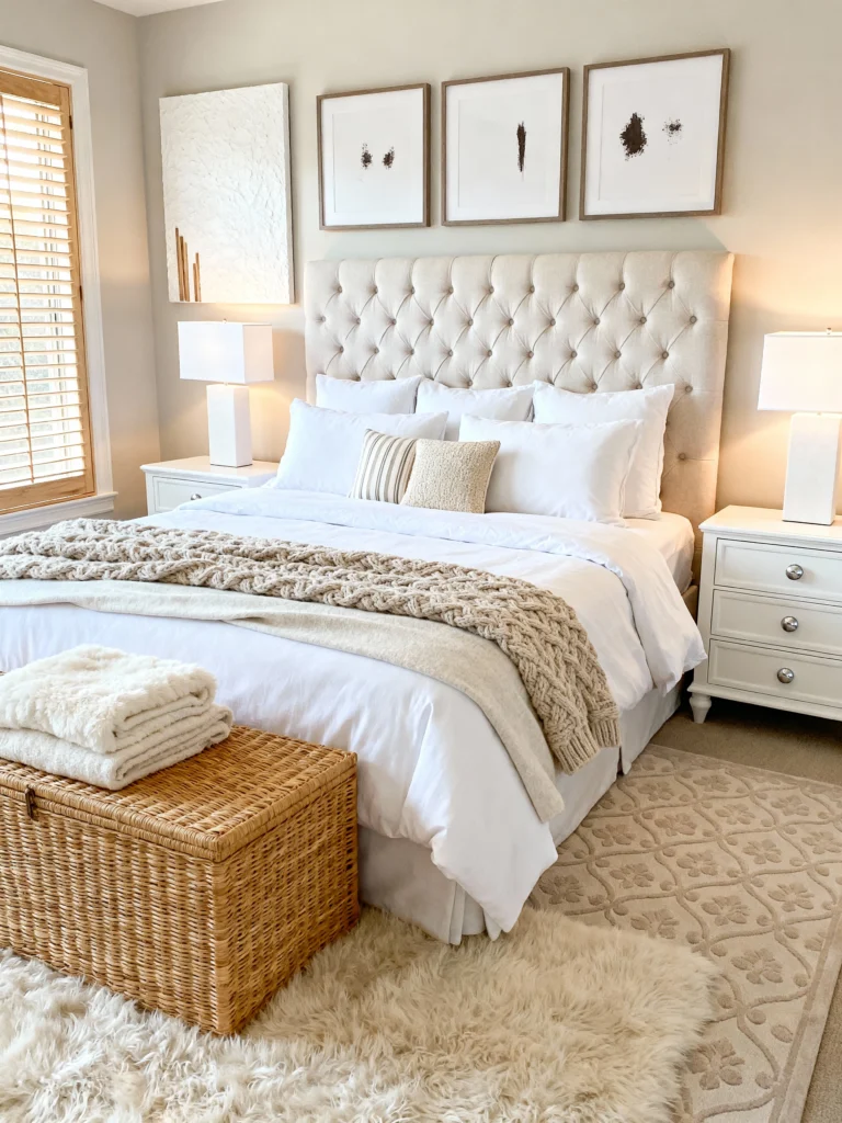 This is the “Clean Girl” aesthetic in bedroom form. It’s all about layers of cream, beige, and white. This style is perfect if you want a room that feels airy and uncluttered. The oversized tufted headboard is the star of the show here.