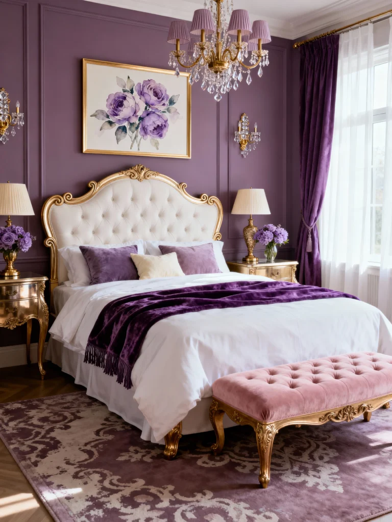 If you’ve ever wanted to wake up feeling like actual royalty, this is the blueprint. This room is all about that stunning gold-trimmed headboard and the intricate wall molding. By pairing a deep plum throw with softer lilac walls, the room feels expensive but not claustrophobic. The crystal chandelier is the “chef’s kiss” moment here, catching the light and bouncing it off those metallic nightstands. It’s classic, it’s sophisticated, and it’s proof that gold and purple are a match made in heaven.