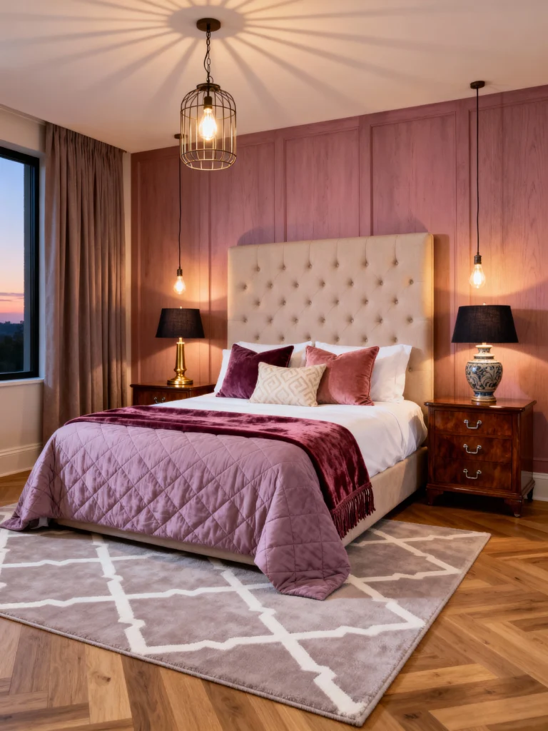 This is such a warm, inviting take on the trend. Instead of sticking to “true” purple, this room mixes in berry and rose tones. The dusty pink headboard against the dark grape walls is such a sophisticated color combo. It feels a bit more organic and “earthy” than some of the other high-glam looks. Also, can we talk about that brass chandelier? It adds the perfect vintage touch to a very modern color palette.