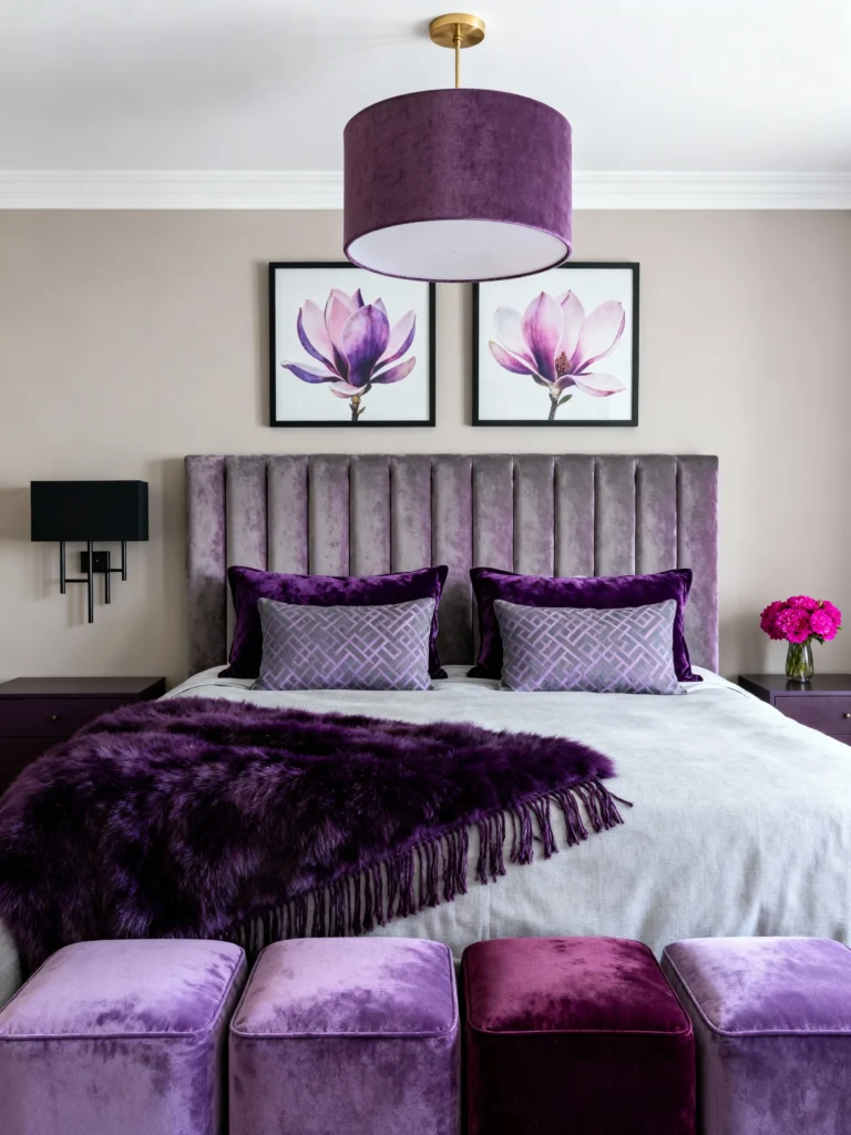 Let’s talk about texture! This room proves that you don’t need a million colors if you play with fabrics. Look at that fluted velvet headboard—it adds so much height and drama. I love how the artwork (those beautiful purple magnolias) pulls the whole look together. The combination of the shaggy purple throw and the sleek velvet ottomans at the foot of the bed creates a space that just begs you to jump in and take a nap. It’s cozy, modern, and very high-end.