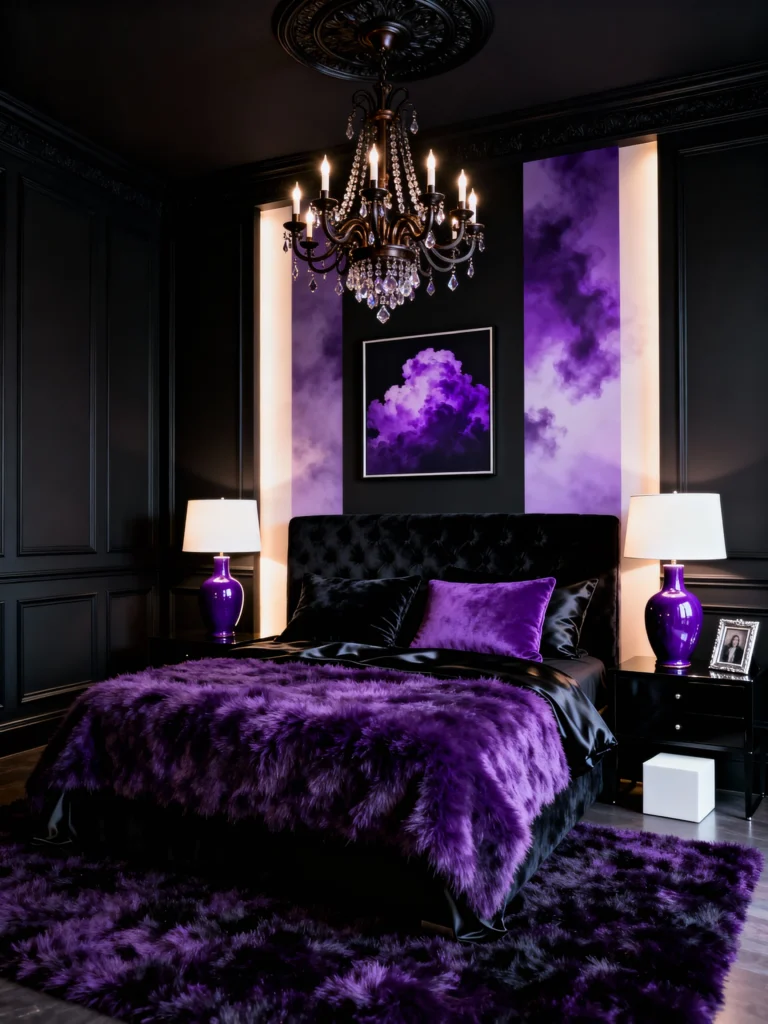 Okay, for my friends who aren’t afraid of the dark—this one is for you. This is dramatic with a capital D. By painting the walls matte black and using purple as the “pop” color through lighting and textiles, you get this incredibly moody, “boutique hotel” vibe. Those glowing purple panels behind the bed look like something out of a dream. It’s bold, it’s mysterious, and that oversized shaggy rug makes the dark floor feel warm and inviting rather than cold.