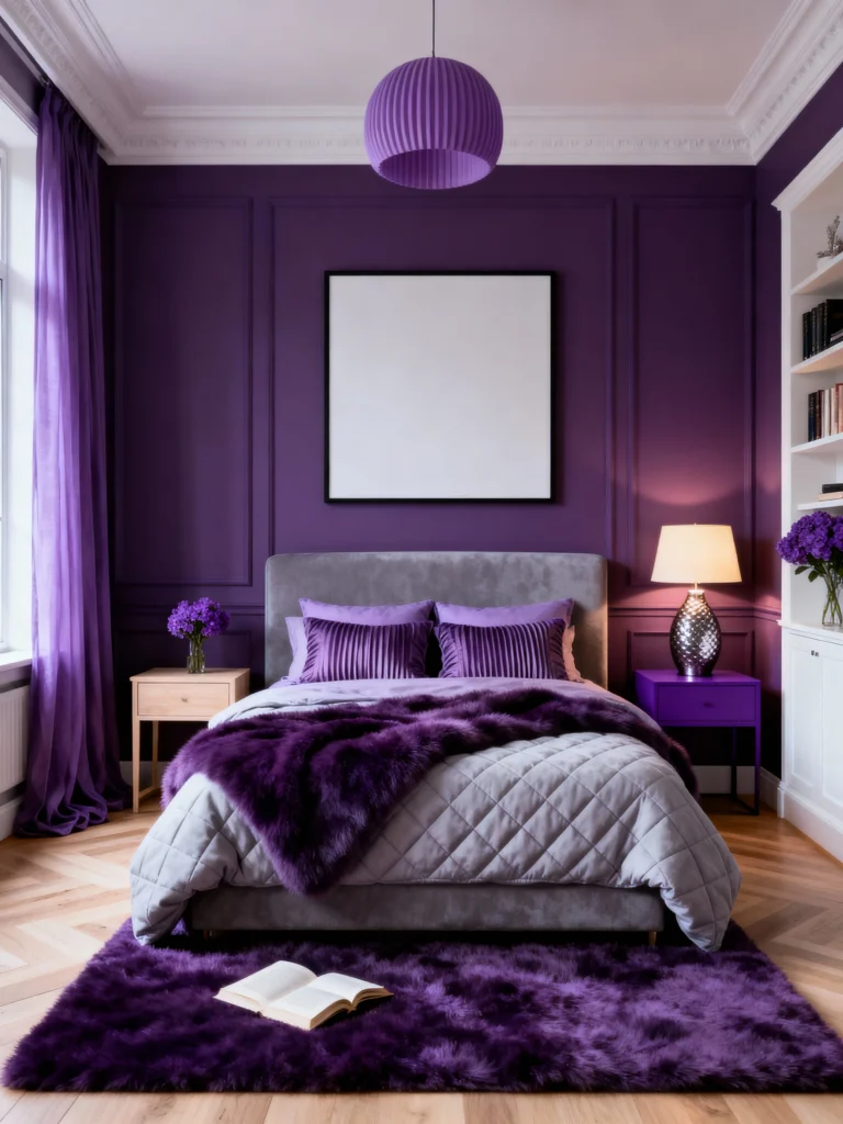 This look is perfect if you like things clean and organized but still want a punch of color. The deep violet walls feature simple paneling that adds depth without clutter. What really works here is the gray bed frame—it acts as a neutral “palette cleanser” so the purple doesn’t overwhelm the senses. The lighting is super soft, which turns that vibrant wall color into something much more soothing. It’s the ultimate “grown-up” purple bedroom.