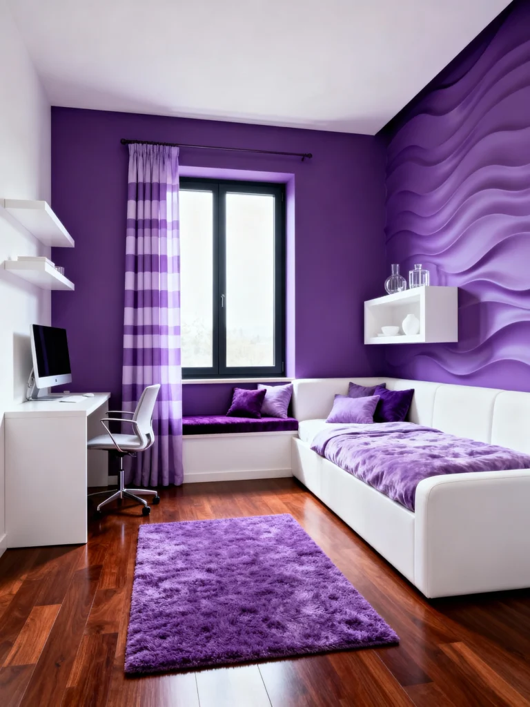 Who says a home office or a guest room has to be boring? This space uses a 3D wave wall in a medium purple tone that is a total conversation starter. It’s bright, energetic, and modern. I love the use of white furniture here; it keeps the small space feeling airy and open. If you’re a creative person, a room like this is basically a battery charger for your brain. Plus, that window seat looks like the perfect spot to read a book while the sun hits those purple stripes.