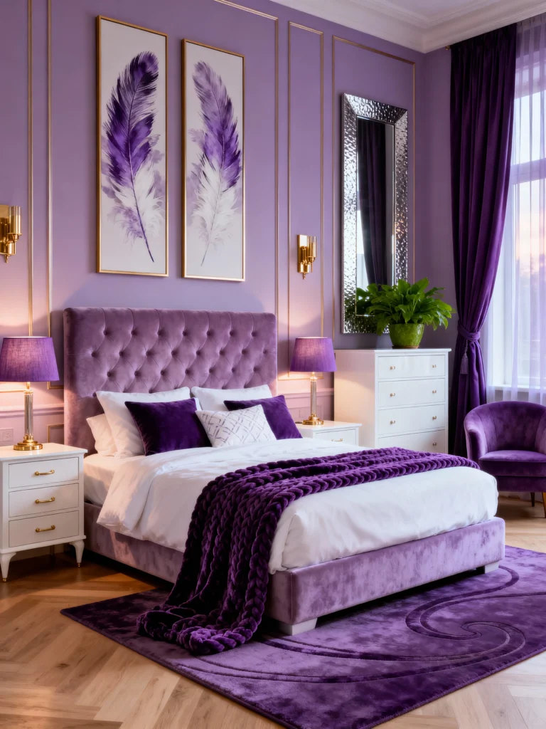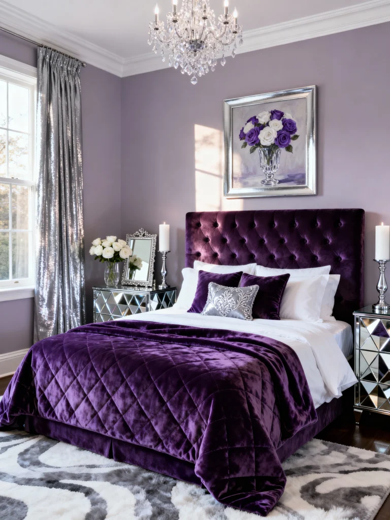 If you love a bit of “bling,” look no further. This room leans into the lavender side of purple but keeps it from looking too sugary by adding silver and mirrored furniture. The sequined silver curtains are a bold move, but they work perfectly with the deep tufted velvet headboard. It’s a mix of textures—velvet, fur, sequins, and mirror—that makes the room feel like a glamorous dressing room from Old Hollywood.