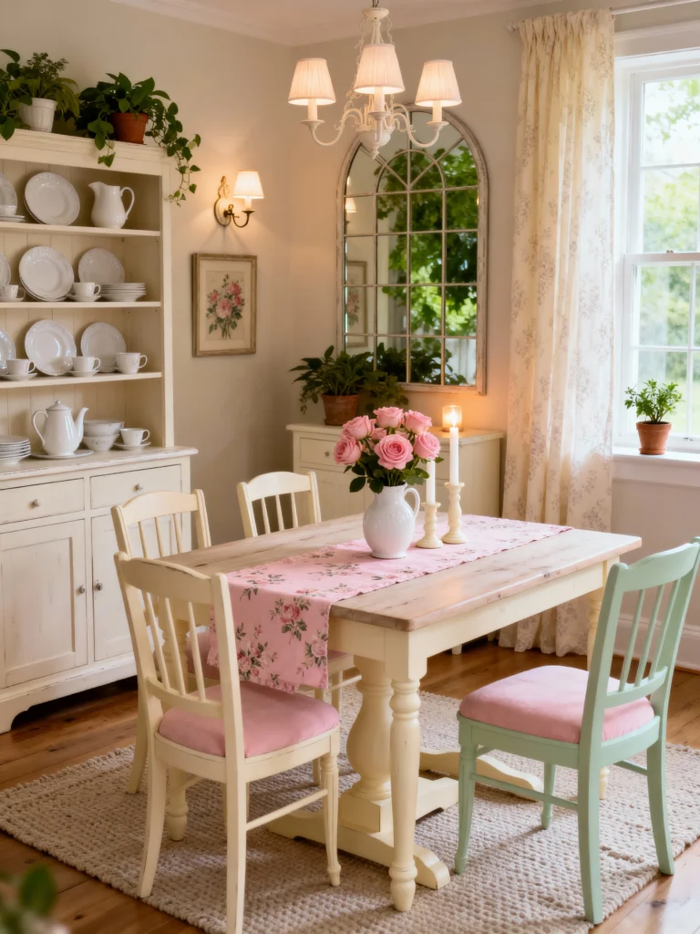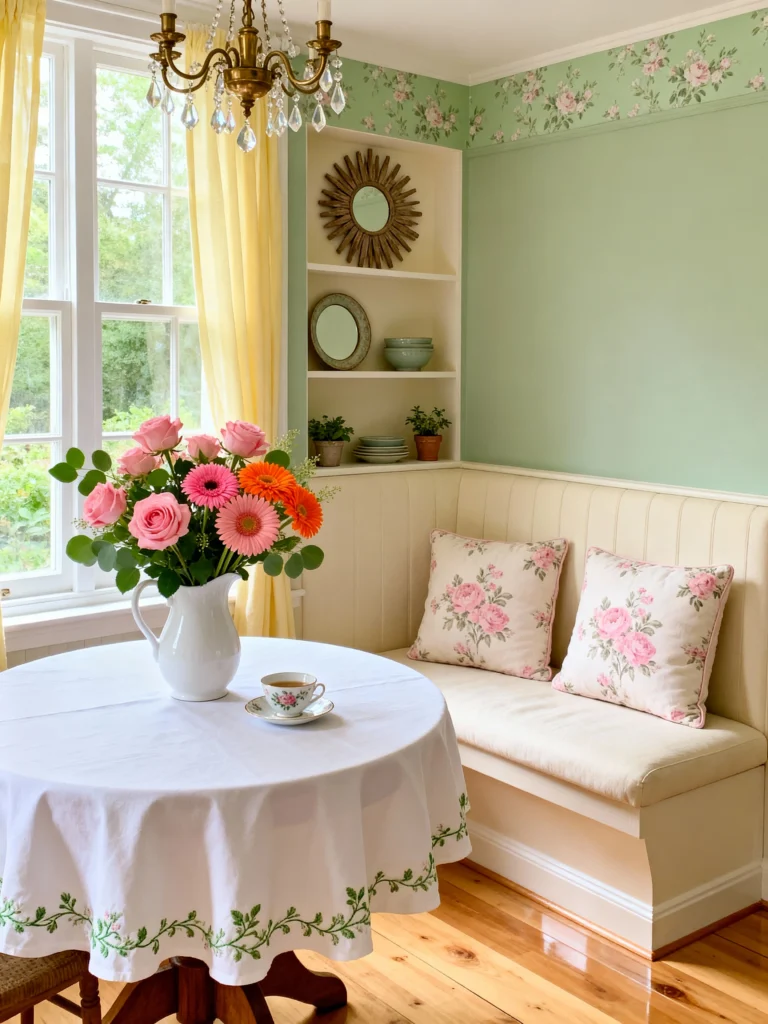 Don’t you just love a dining room that feels like a permanent garden party? This space is the heart of the home. I’m a huge fan of the mismatched chairs—especially that one mint green pop against the creamy whites. It keeps things from feeling too stiff. The floral table runner and those pink velvet seat cushions add just enough “softness” to balance the rustic wooden tabletop. It’s the perfect spot for a long Sunday brunch.