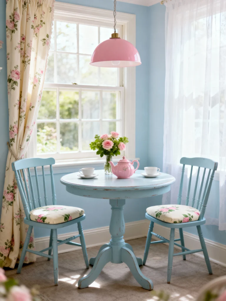 Finally, look at this adorable little bistro set! It’s proof that you don’t need a huge house to have a beautiful “moment.” The distressed blue table and matching chairs are so charming. Using a pink pendant light to match the teapot is such a sweet, intentional touch. It’s a quiet, peaceful corner that practically begs you to sit down, slow down, and enjoy a cup of tea.