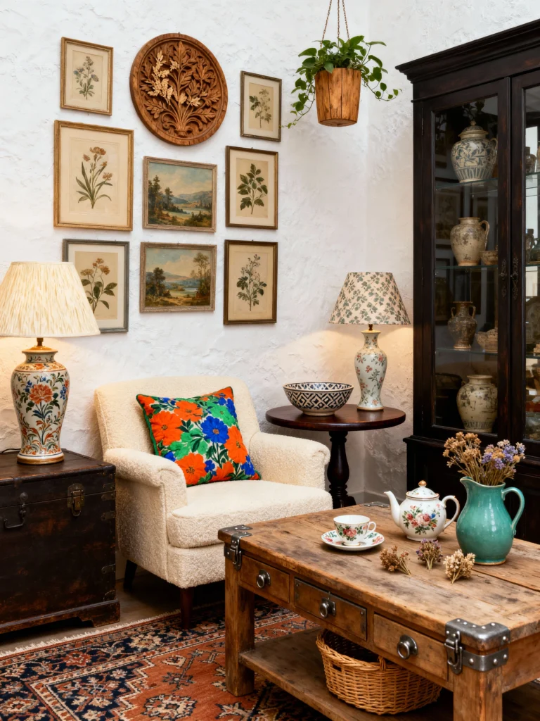 This corner feels like it has so many stories to tell! It’s a bit moodier than the rest, but that’s why it works. The dark wood hutch and the old trunk-turned-table give the room some real “grounding.” I’m obsessed with the gallery wall—mixing botanical prints with that carved wooden plate is such a clever way to add texture. And that bright orange floral pillow? It’s the perfect “look at me” moment in a room full of antiques.