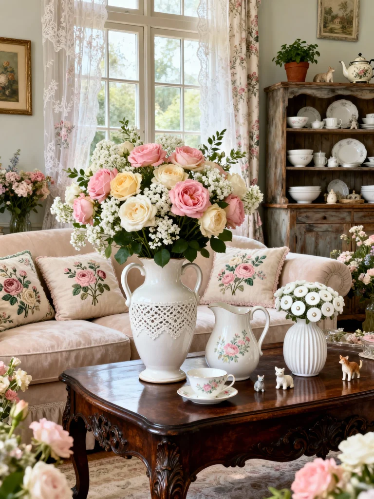 Can we talk about that massive bouquet? It’s the star of the show! This living room is a masterclass in shabby chic layering. You’ve got the lace curtains, the velvet sofa, and the intricately carved coffee table all living together in harmony. It feels very “English countryside cottage.” If you want to recreate this, the secret is in the details—like the tiny animal figurines and the floral-embroidered pillows.