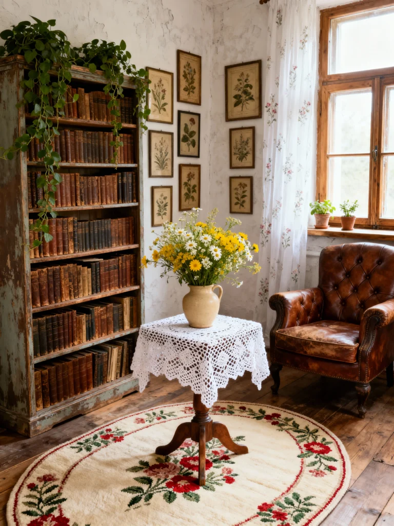 Every book lover needs a corner like this. The distressed blue bookshelf is full of character, and I love how the ivy just drapes down the side. The leather wingback chair looks like the ultimate spot to get lost in a novel. Adding a lace-covered pedestal table in the middle of the room is such a classic “shabby” move—it breaks up the heavy wood and adds a delicate touch.