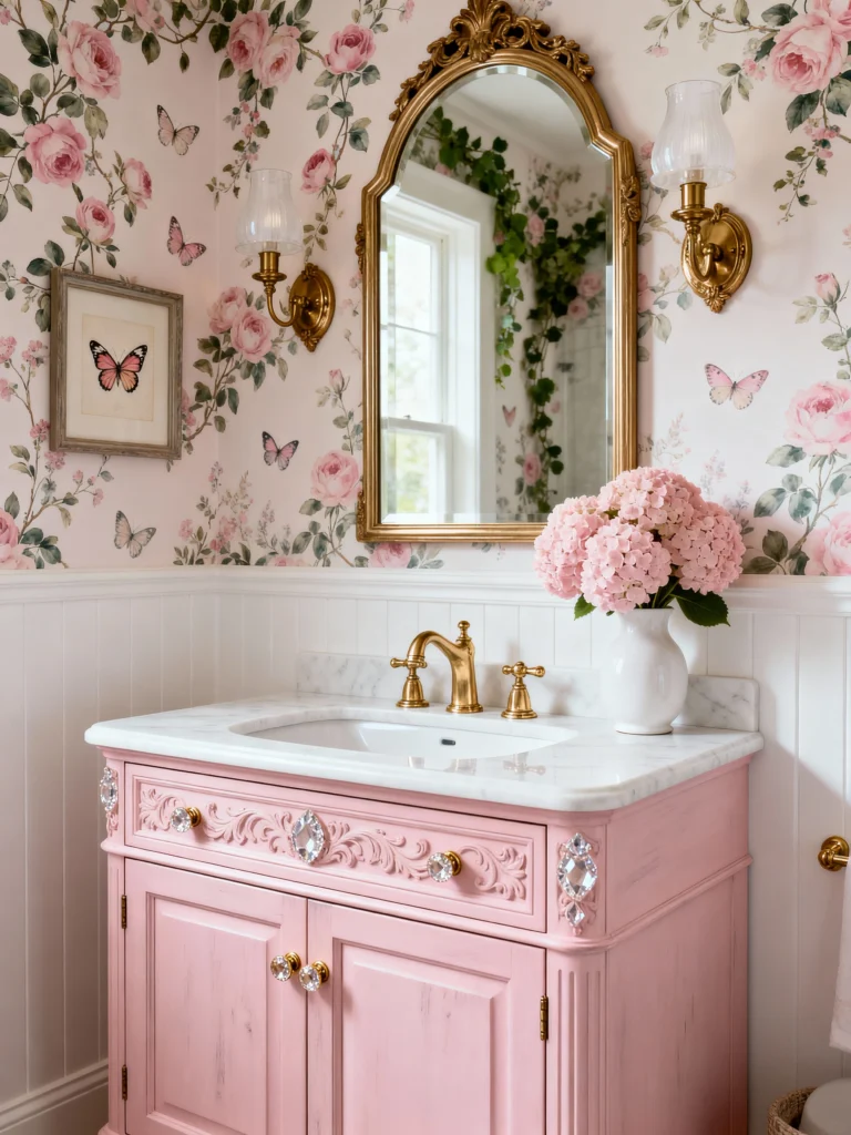 Who says bathrooms have to be boring? This vanity is pure elegance. The blush pink cabinet with those crystal knobs makes it feel so high-end, yet the floral wallpaper keeps it whimsical and fun. Pairing the gold hardware with the marble top is a classic combo that never fails. It’s the kind of space that makes getting ready in the morning feel like a special occasion.