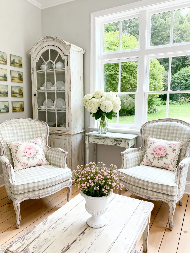 There’s something so timeless about checkered upholstery. These wingback chairs are the perfect mix of country and chic. I love the neutral palette here; the whites and light greys make the room feel incredibly airy and bright. The distressed “chippy” paint on the side table is the epitome of the shabby chic look—it proves that a little wear and tear only makes things more beautiful.