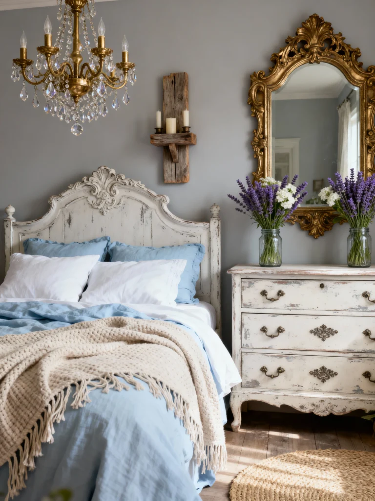 This bedroom is the definition of tranquility. The weathered white headboard has such beautiful ornate carving, and it looks stunning against that soft grey wall. The mix of light blue linens and a chunky knit throw makes the bed look like a cloud. And that gold mirror? It reflects the light from the chandelier perfectly, making the whole room glow. It’s the perfect place to end the day.