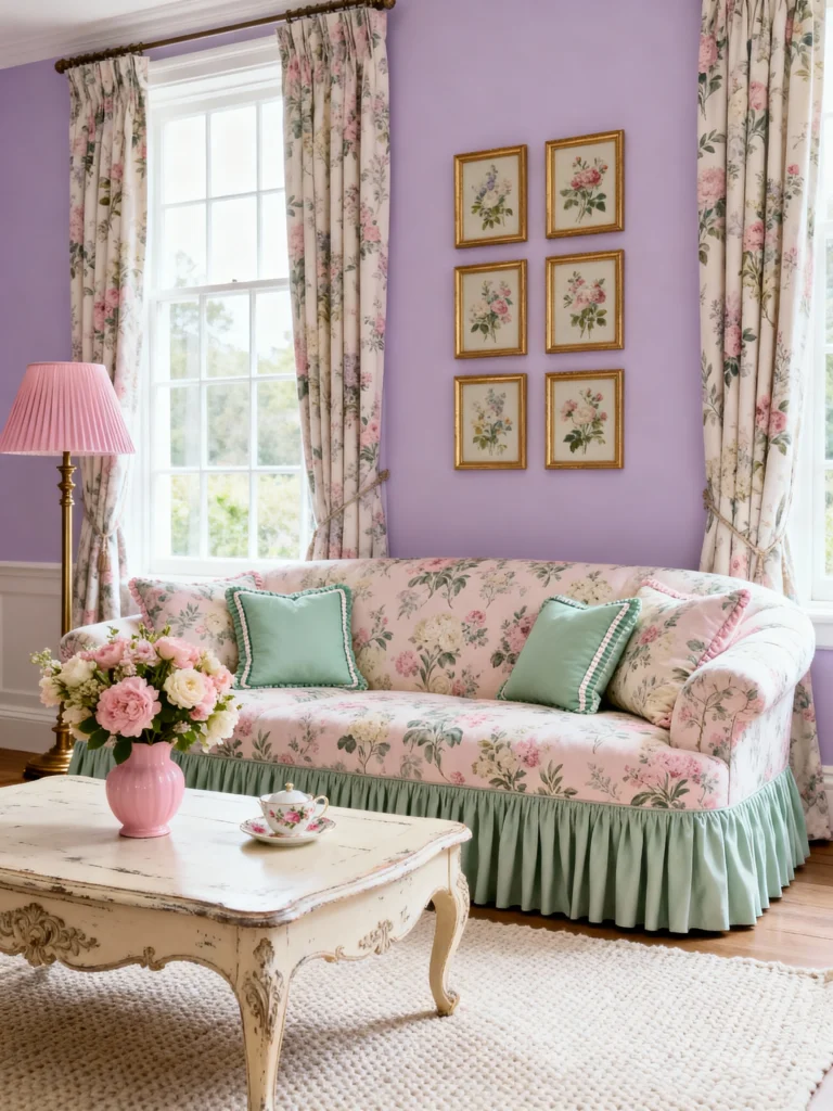 If you want a room that instantly makes you feel cheerful, take notes from this space! The walls are painted in a soothing lilac or soft lavender—it’s a bold but beautiful choice. And talk about commitment to a theme: that beautiful, ruffled sofa with its pink and green floral pattern is just stunning! The pale mint green on the sofa skirt and throw pillows ties in perfectly with the florals. The windows are framed by matching floral drapes, creating a cohesive, lush look. To keep the flow light, they’ve added a beautiful, chunky, white woven rug and a distressed white coffee table. The gold-framed botanical prints on the wall really complete this elegant, airy, and feminine sitting area.