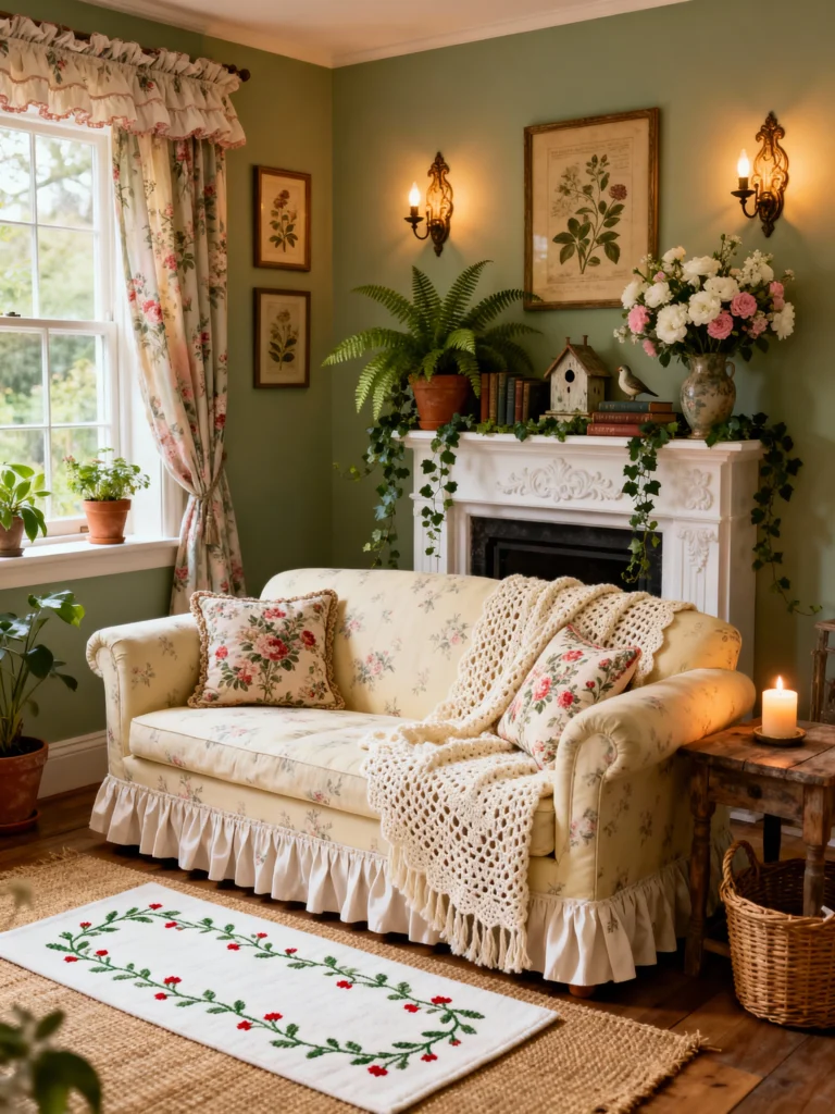 This image is a dream come true for anyone who loves layers and color! It’s an absolute masterclass in maximalist decorating. The wall is packed, floor-to-ceiling, with a stunning collection of framed artwork and textiles, most featuring glorious floral motifs. The different sizes and frames add incredible visual interest. Below the gallery, the sofa is a cozy canvas piled high with texture: a vintage-style crocheted afghan, embroidered pillows, and a cheerful green honeycomb blanket. The small, mint-green cabinet and pink side table add a playful contrast. It shows you don’t have to be afraid of mixing patterns, styles, and a ton of color to create a space that feels personal and full of joy.