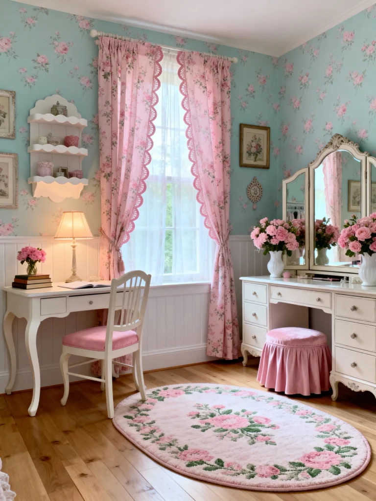This room is pure sweetness! It screams romantic getaway. The walls are covered in a charming aqua blue floral wallpaper, giving the whole space a vintage, dollhouse feel. The crisp white wainscoting keeps the bottom half clean and bright. Look at those curtains! They are pink and floral, matching the rug, and have a scalloped lace trim that’s just adorable. It’s set up as a lovely little writing nook or vanity area, with a chic white desk and a large white dressing table with a triple mirror. The coordinating pink ottoman and the oval rug with an embroidered rose pattern tie all the delicate details together beautifully. This would be the perfect bright, inspiring place to work or get ready for the day.