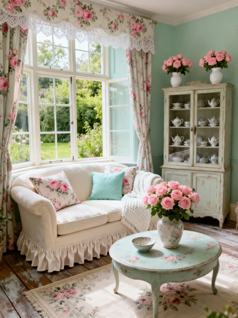 This room is the absolute picture of a bright, romantic sunroom! The soft mint-green walls create a refreshing, light atmosphere, perfectly complementing the view of the lush garden outside the large window. The sofa is a classic, skirted piece, kept simple in an off-white fabric and dressed up with rose-print pillows. The small, distressed china cabinet is a fantastic piece of accent furniture, and the little coffee table, painted in a matching mint with floral detailing, is a unique touch. With fresh pink roses everywhere, this space feels incredibly fresh, serene, and is the ideal place to sit and enjoy the beauty of the outdoors from the comfort of inside.
