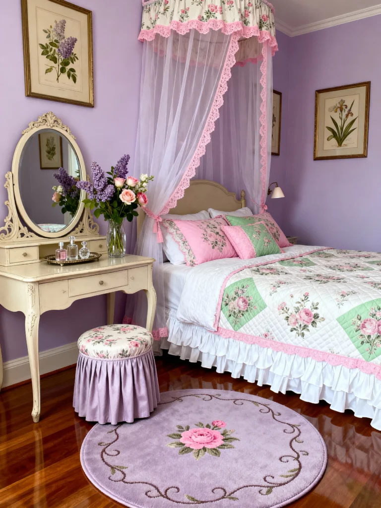 Here’s another gorgeous bedroom that uses lilac walls to create a vibrant yet calming space. The lavender backdrop makes the crisp white of the bedding and the dressing table really pop. The bed itself is draped with a light, airy canopy accented with pink trim, instantly adding a romantic, feminine vibe. The floral quilted coverlet features soft pink and mint green squares, a perfect complement to the wall color. I love the addition of the round, purple rug with the central embroidered rose—it’s a fantastic, cozy grounding element for the space. Paired with the vintage vanity table and the framed botanical prints, it creates a luxurious, restful, and subtly regal feel.